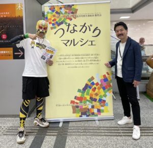 当園は1日と2日に出店したのですが、その話の前になんと30日の日につながりマルシェを主催しているNPO法人東大阪障害者共同受注連絡会のホームページができたことで、告知をしてくださる為に布施プロレスの代表であるマスクド東大阪さんがビラ配布をしてくださいました!